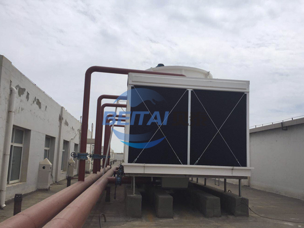 橫流式玻璃鋼冷卻塔內的填料采用兩面有凸點的點波片,通過安裝頭使點波片粘結成整體,以提高剛性,兩面的凸點還可避免直接滴水,因此提高了水膜形成能力,填料尾部設有收水措施。